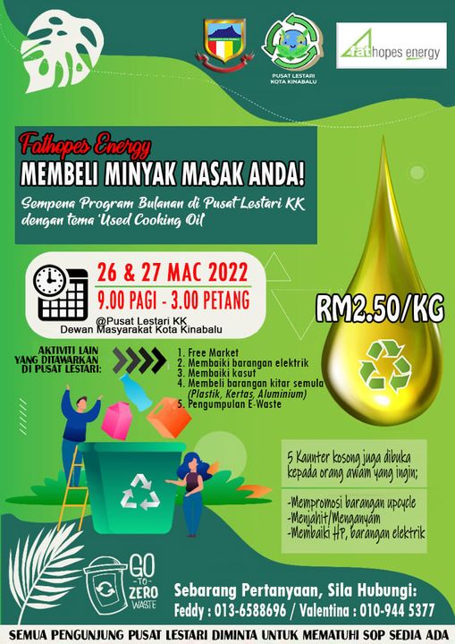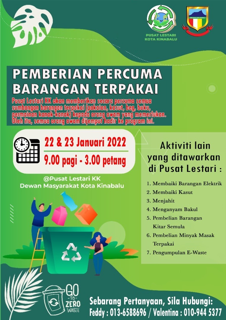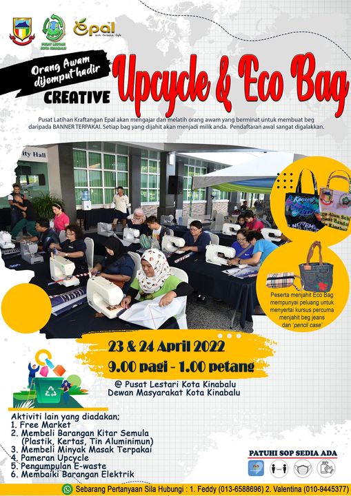 Sertai Program Creative Upcycle & Eco Bag pada 23 & 24 April 2022, bermula jam 9.00 pagi hingga 1.00 petang di Pusat Lestari Kota Kinabalu, Dewan Masyarakat Kota Kinabalu.
